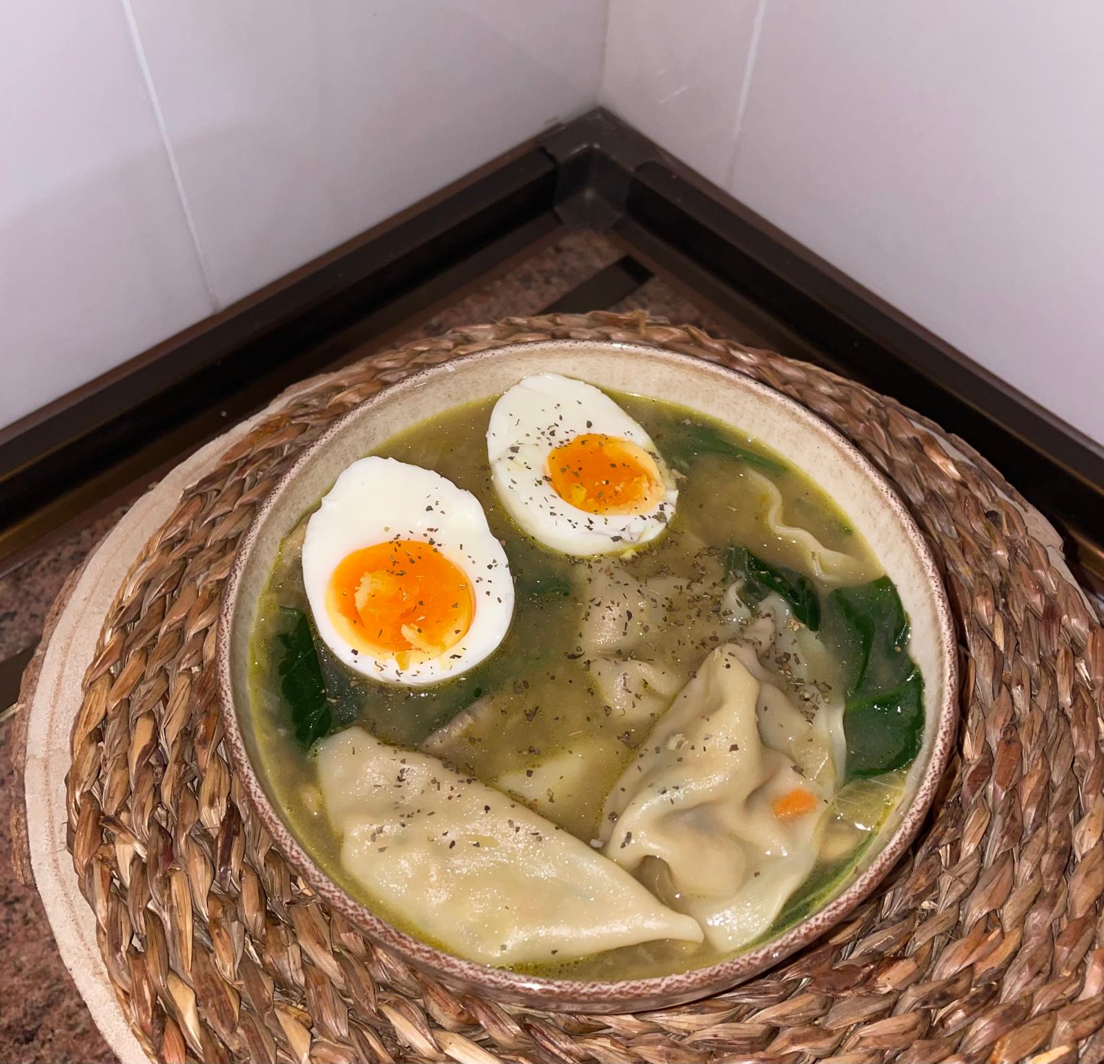 Las gyozas aportan estructura y carácter, mientras que los champiñones y las espinacas frescas equilibran el conjunto con notas terrosas y vegetales. El huevo cocido, servido al final, añade cremosidad y redondea el plato con elegancia.