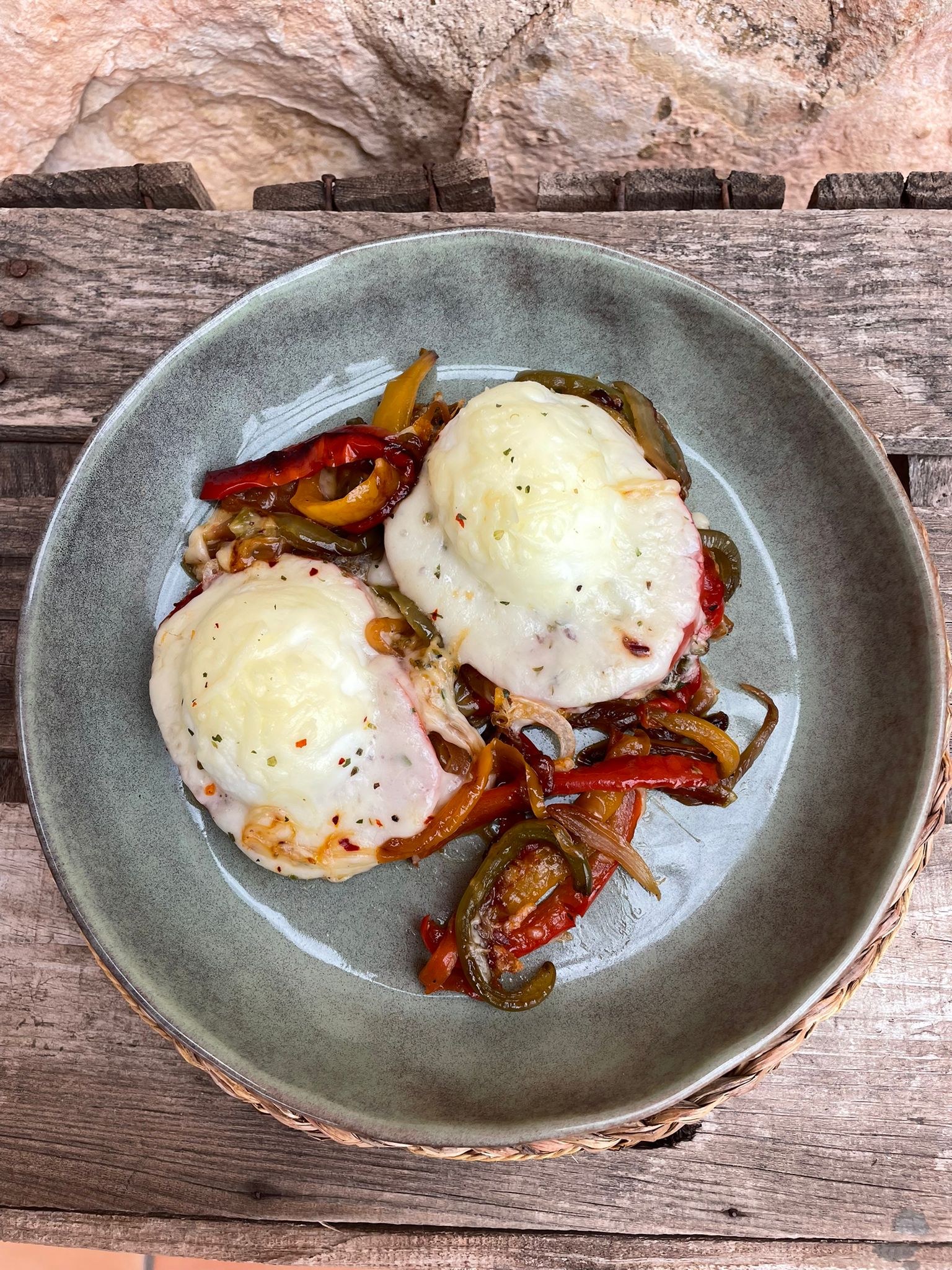 • Añade por encima la mozzarella. Tapa la sartén y deja que el queso se funda y gratine ligeramente durante 2–3 minutos.